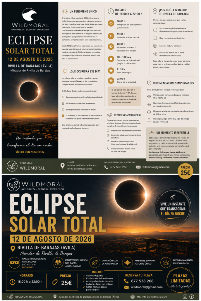 Desde Wildmoral hemos organizado una experiencia especial para disfrutar de este momento irrepetible desde el mirador de Rivilla de Barajas, un enclave privilegiado que ofrece un horizonte abierto ideal para la observación.
